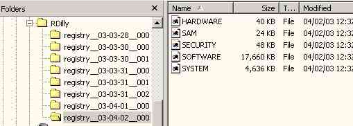 (in YY-MM-DD format) and a serial number starting with 001 as its name.Start, Finish, and Error messages are placed in the Application Eventlog under the source name "RDilly". In this folder, you will see the same hive names you see in %SystemRoot%\system32\config. The hives are ready to manually copy in the case of a disaster. If the system is bootable, RDilly can restore the registry in just a few clicks.